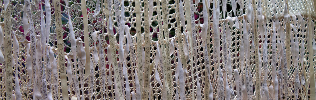 I developed the Cloak of Gratitude,over the course of a year. I made the base of the cloak by by piecing together found crochet with sections I crocheted. I asked a wide range of people to contribute statements of gratitude using the format: I am grateful that . . . or I am grateful for . . .